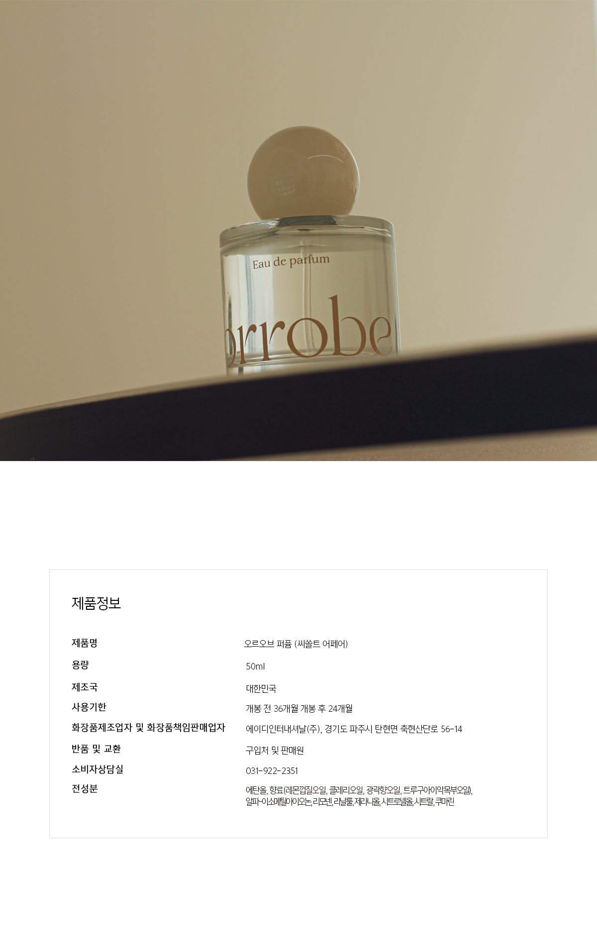 살갗을 스치는 짭조름한 바닷 바람, 세이지와 허브의 향이 안개처럼 은은하게 퍼지면, 화이트플로럴향이 파도처럼 부드럽게 감싸옵니다. 밀려왔다 천천히 사라지는 파도처럼, 머스크와 우디 노트가 잔잔한 여운을 남깁니다.