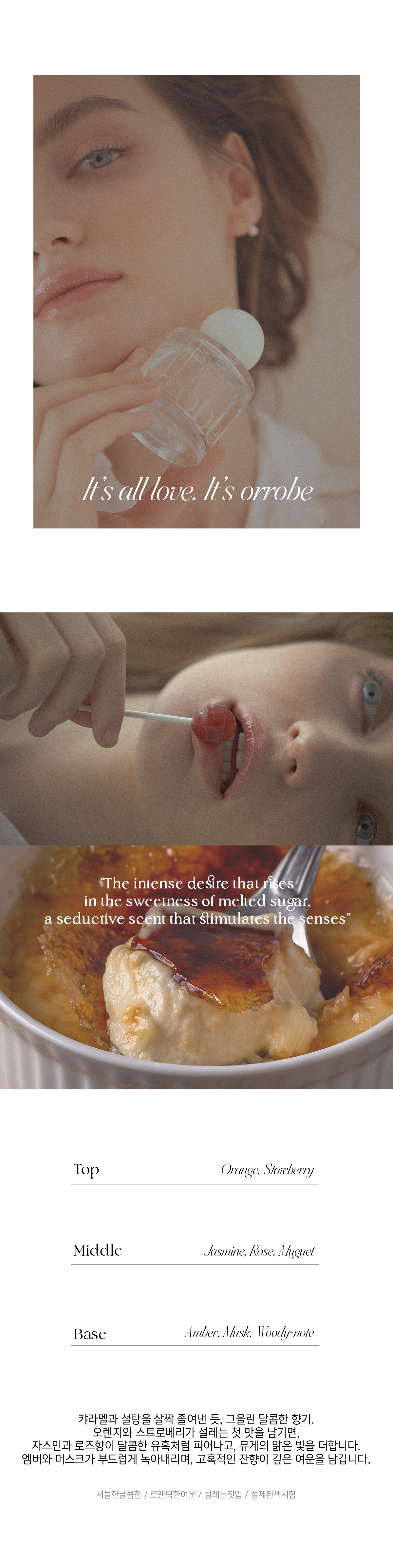 캬라멜과 설탕을 살짝 졸여낸 듯, 그을린 달콤한 향기. 오렌지와 스트로베리가 설레는 첫 맛을 남기면, 자스민과 로즈향이 달콤한 유혹처럼 피어나고, 뮤게의 맑은 빛을 더합니다. 엠버와 머스크가 부드럽게 녹아내리며, 고혹적인 잔향이 깊은 여운을 남깁니다.